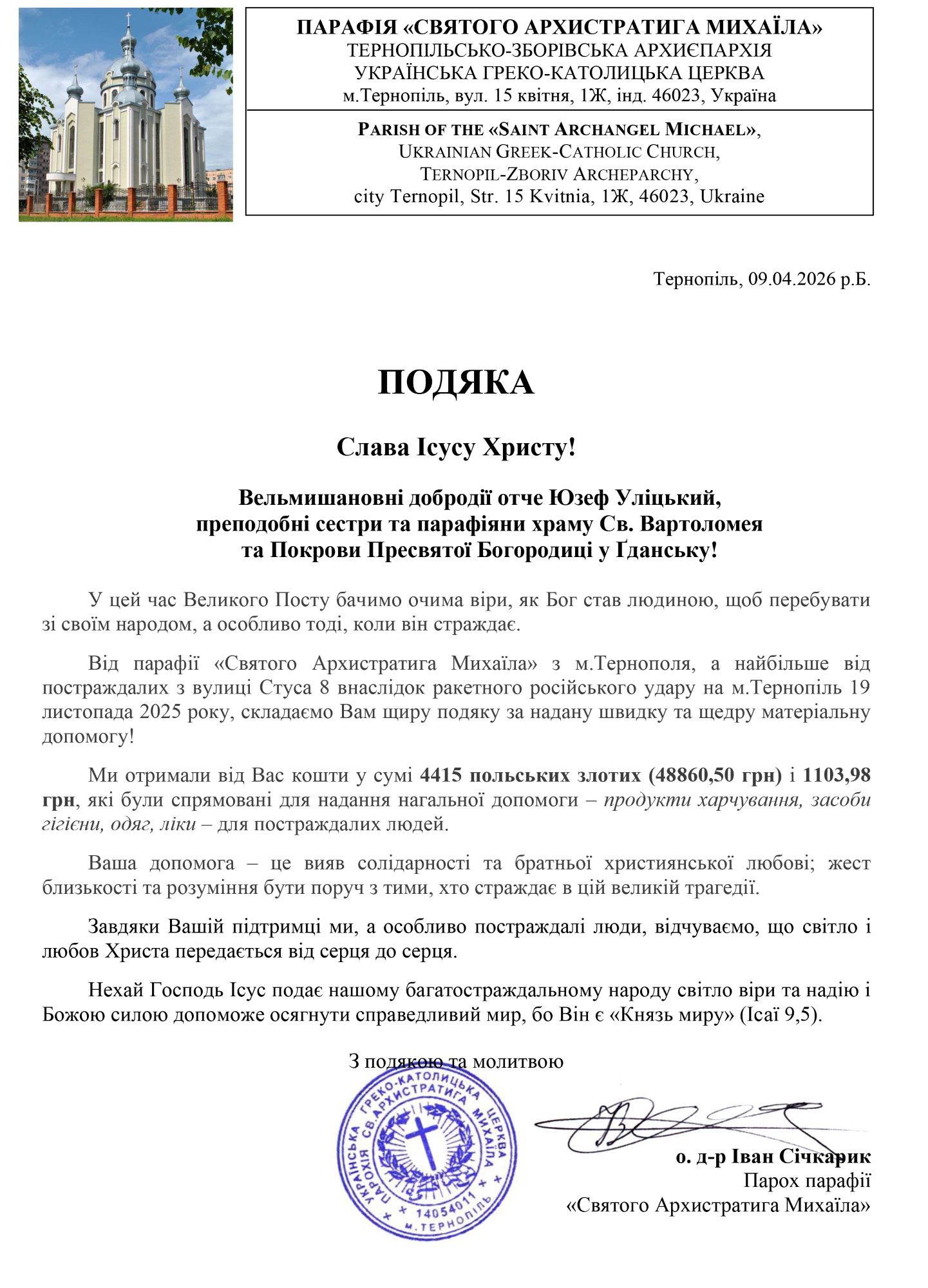 Подяка за допомогу PARAFIA GRECKOKATOLICKA W GDAŃSKU Opublikowano w 17 kwietnia 2026 przez Webmaster17 kwietnia 2026 Надійшли слова подяки для гданської прокатедральної парафії від Греко-католицької парафії св. Архистратига Михаїла в м. Тернопіль в Україні.